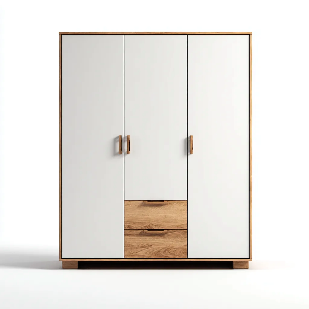 Armadio pensato per camere da letto e ambienti domestici dallo stile nordico. Il design lineare con superfici chiare e dettagli in legno naturale offre una soluzione pratica per l'organizzazione quotidiana degli indumenti.
