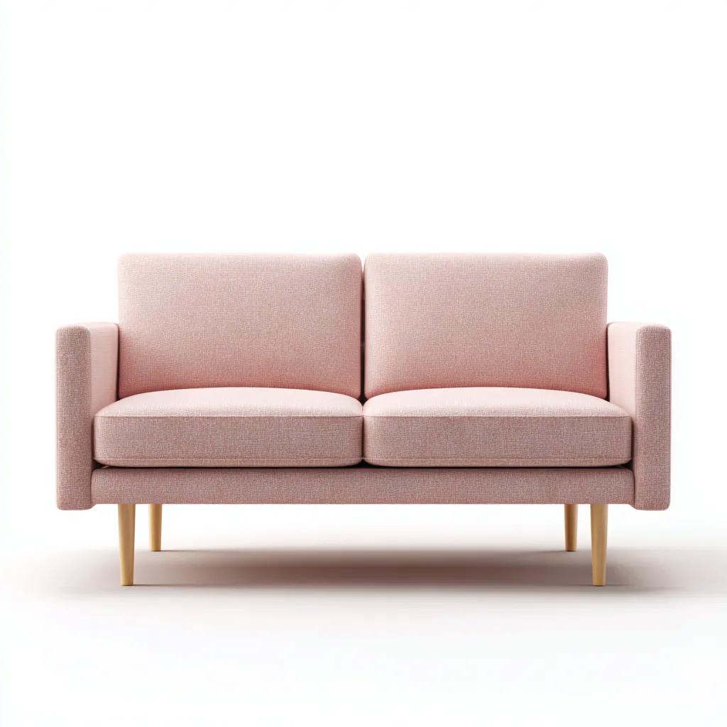 Rivestimento in tessuto di colore rosa chiaro con texture fine e uniforme. La struttura interna garantisce stabilita e comfort mentre i piedini in legno assicurano un supporto solido e un aspetto naturale e contemporaneo.